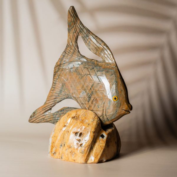 Add a refined artistic touch to your space with this handcrafted semi precious stone fish sculpture. Expertly carved by skilled artisans, this luxury decor piece highlights the natural beauty of stone, making every sculpture truly one of a kind.