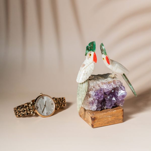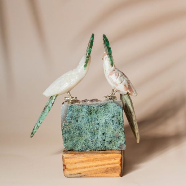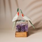 Expertly carved from white quartz and green calcite and elevated on a natural amethyst geode base, this sculptural piece captures elegance, symmetry, and intricate detailing. Each parrot is individually handcrafted, making every sculpture truly one of a kind.